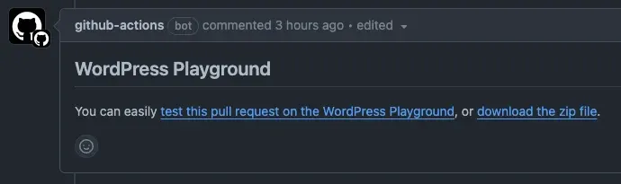 For very simple manual testing, I recommend using the WordPress playground (which I recently wrote about). I’ve created a very simple workflow action that leaves a comment on every pull request, with a link that opens the zip of that pull request in the Playground. This only works for plugins without a build process, so if you have an autoloader, it should work without that build, or you should adapt the workflow. But it’s proven very useful for quick testing of changes without having to spin up local environments or do anything else, really. It looks like this: