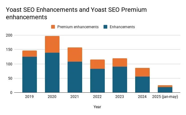Since 2021, Yoast SEO has introduced fewer enhancements, with a notable decline in 2024, and early indications for 2025 suggest a continued downturn. Rank Math exhibits a similar trend, with a marked slowdown in innovation during 2024 and 2025. In contrast, AIOSEO experienced a surge in new features in 2024, but projections for 2025 (based on changelogs so far) also indicate a significant decline.